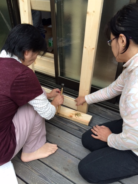 青葉台の工務店「富士ソーラーハウス」の大澤さんに講師になって頂いて、木の切り方からトンカチのたたき方など何から何まで教えていただき、多数の参加者が協力しあってようやく完成しました。