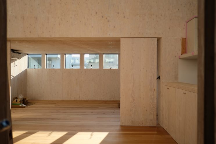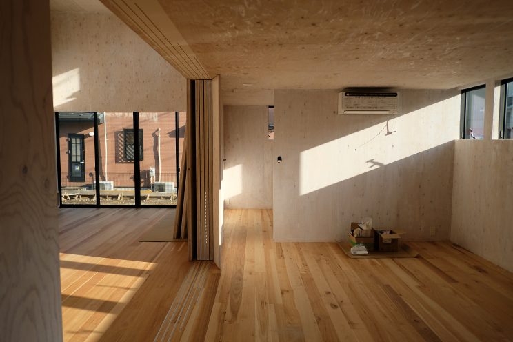 外壁はシルバーグレーのガルスパン。内壁、天井、内部建具は構造用合板を採用、オスモカラーワンコートオンリー塗装仕上げ。床材はヒッコリーフローリングが採用されています。