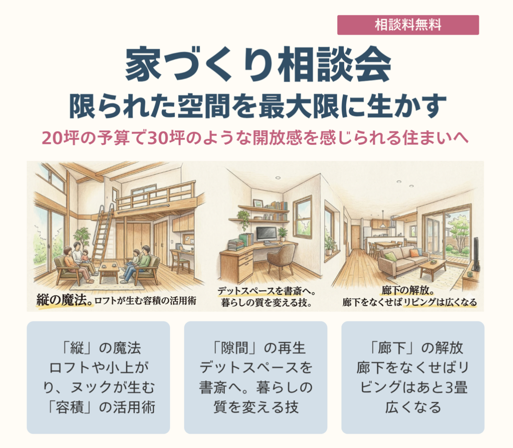 今回は、限られたコストでも“広がり”と“豊かさ”を感じられる住まいのつくり方をテーマにした相談会です。