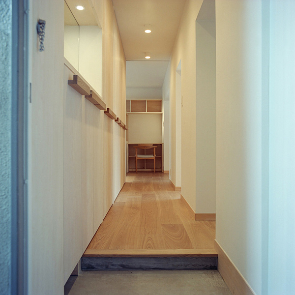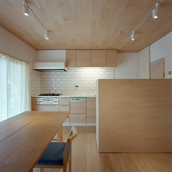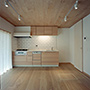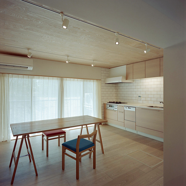 子供が独立し、再び夫婦二人での生活となるということで、奥さんの実家の45年前に建てられた団地を、夫婦2人で暮らすのにちょうどよい住宅となるようリノベーションしました。階高が低く天井の高さが取れない構造であることと、外部に気持ちの良い緑地スペースが広がっていることを活かして、高さ方向の開放感を追求するのではなく、水平方向の広がりによって「圧迫感」ではなく、「落ち着く」と感じられる空間を考えました。