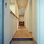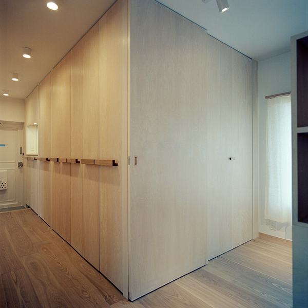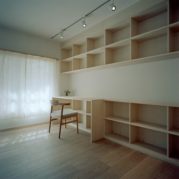 夫婦互いに専門性のあるお仕事をされていることもあり、それぞれの個のワークスペースを独立して持ちつつ、部屋として完全に区切るのではなく躯体壁や造作の可動棚、引込める建具などで緩やかに仕切り、最大限開放的なLDKを実現しつつ、互いの距離をその時々で選択できるようになっています。