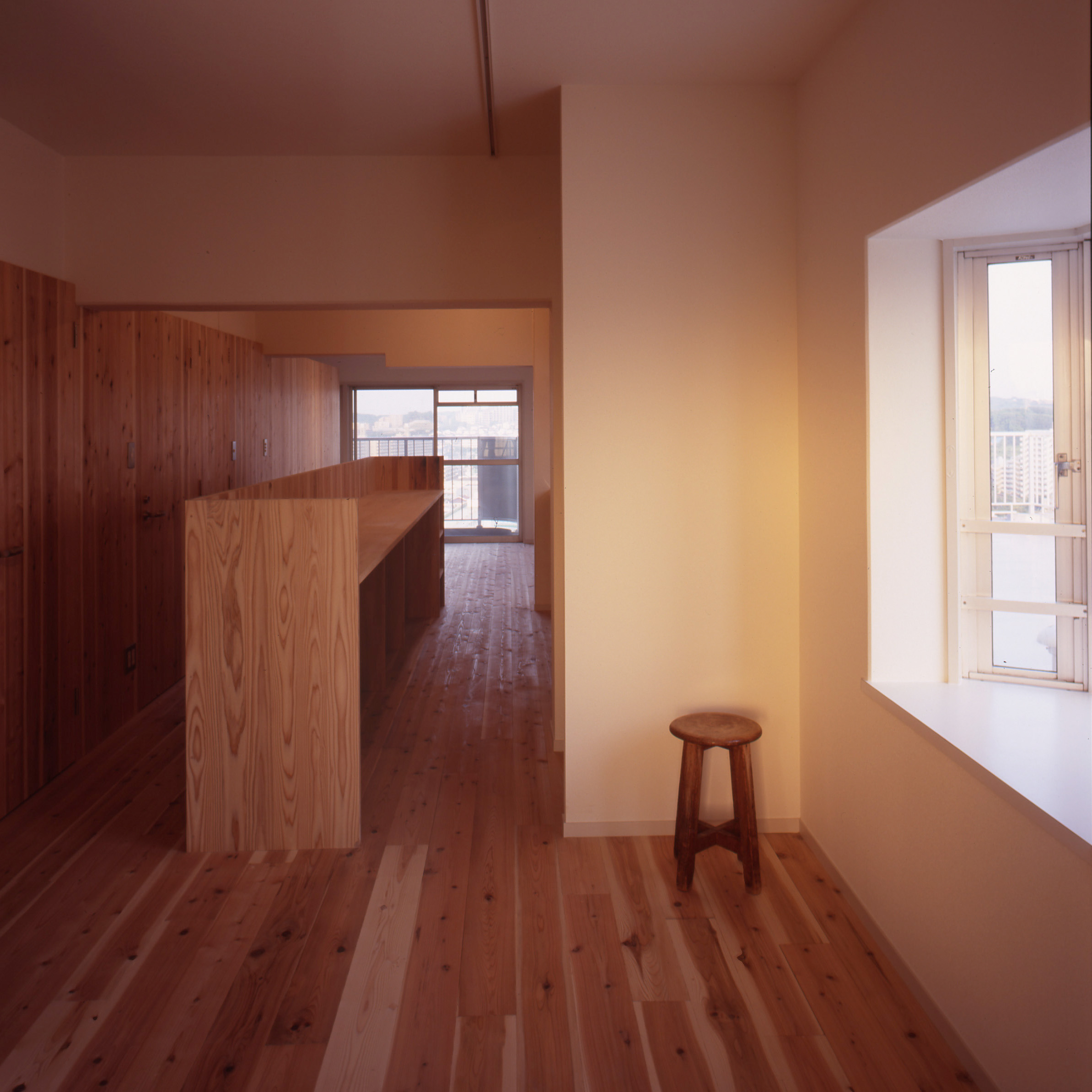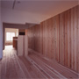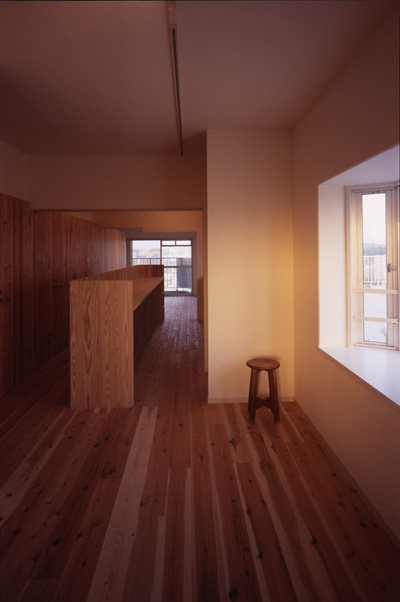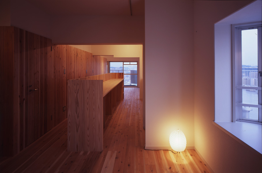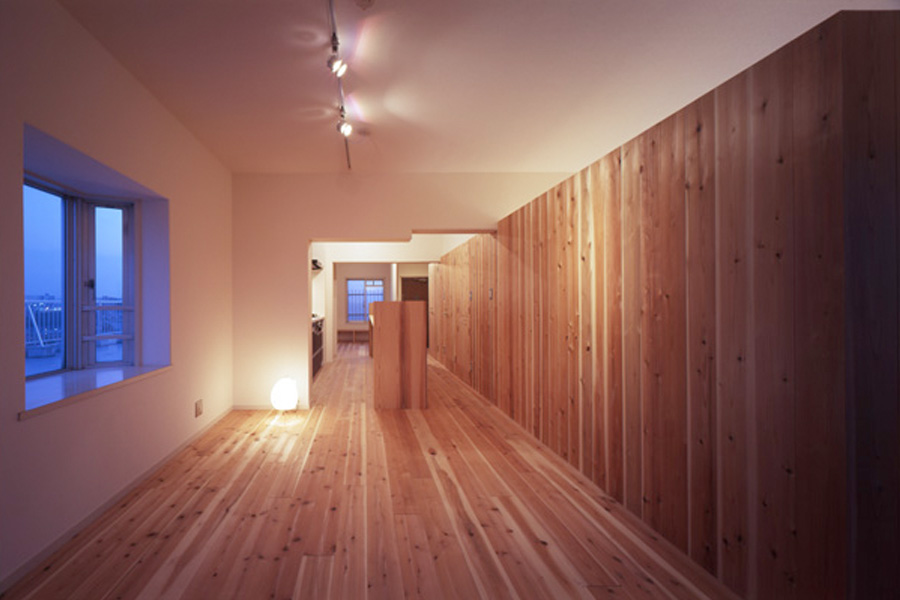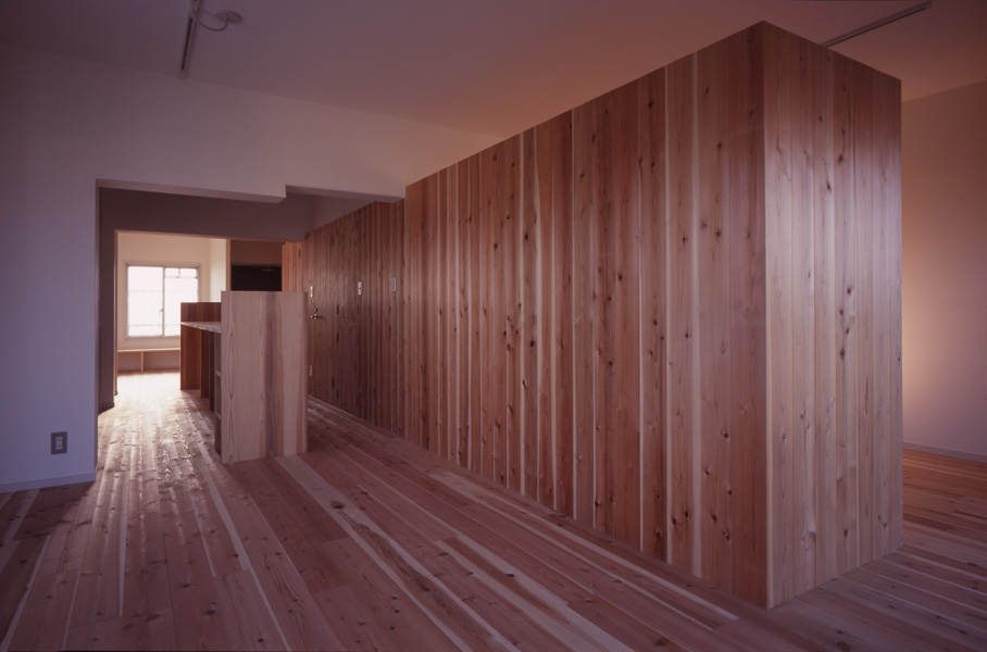 連続した杉の壁は、天井より低い位置で設定しました。扉も同材で隠し扉として計画し、材料を揃えて要素を減らすことで「広さ」を演出したつもりです。LDKは回遊できる、大きなワンルームの構成としています。