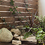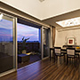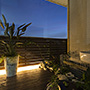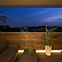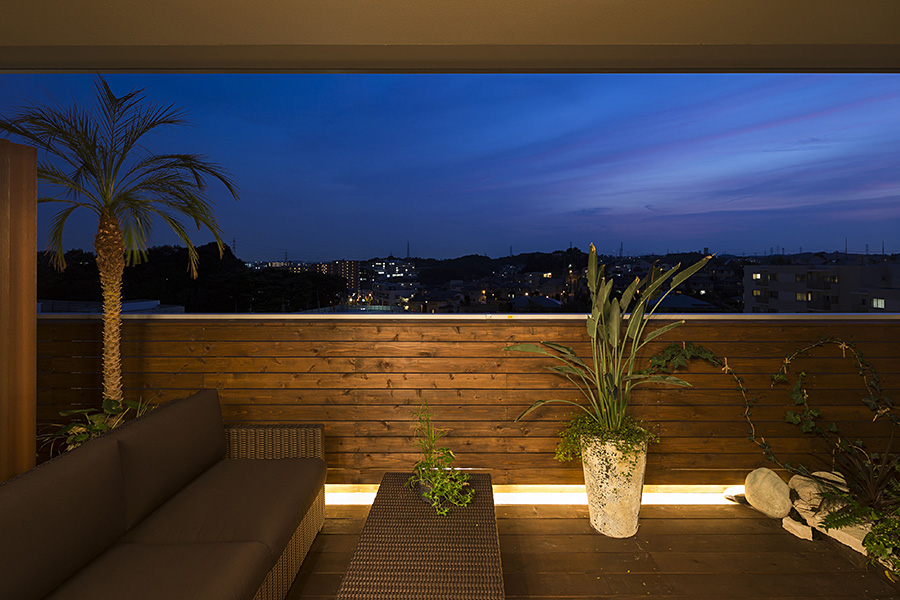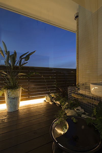 内外を空間として一体化させるためには、内と外の境界を現状より外側に延長させることが必要であり、その境界としてバルコニーの腰壁に木ルーバーを貼ることで新たな距離感をつくりだし、リビングバルコニーという関係性を生み出しました。夜には間接照明を仕込むことでその奥行きを強調させています。既存の味気ない腰壁が、景色を切り取る額縁として生まれ変わりました。
