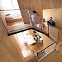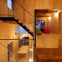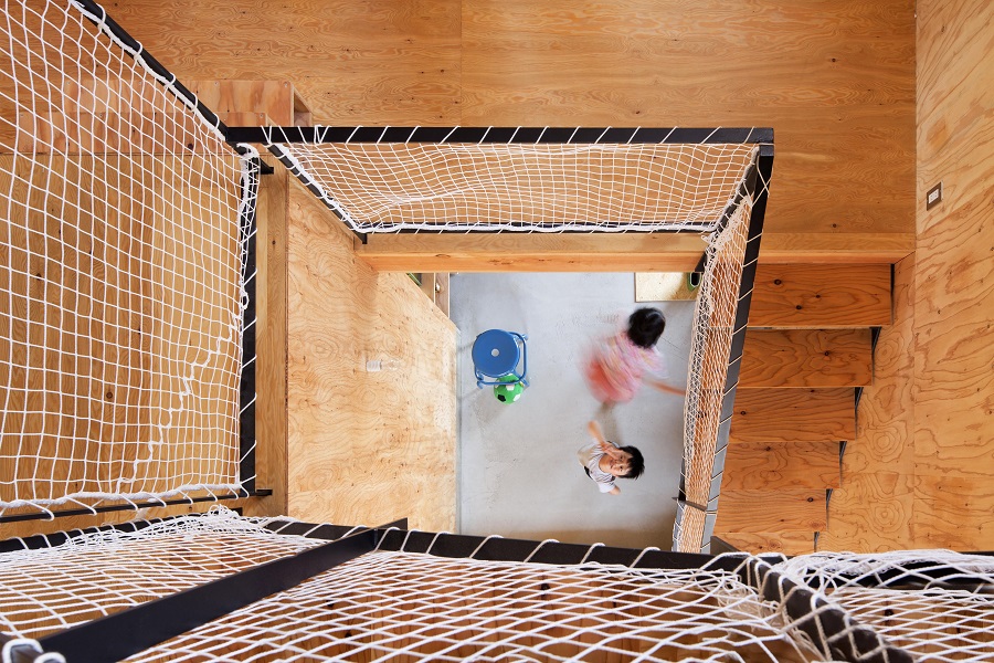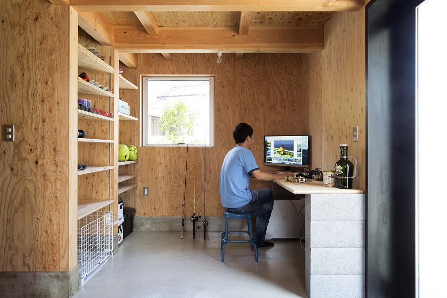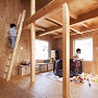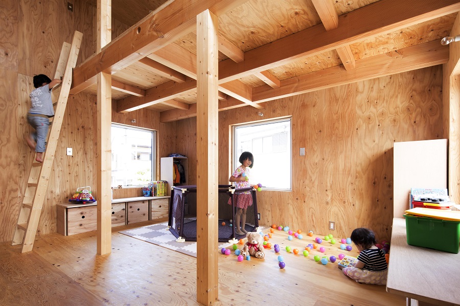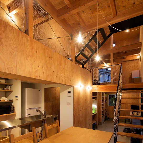 コストの関係上、やや狭小寄りになったこの住宅に広がりを持たせる為、7枚の床レベルをランダムにスキップさせた、2階建のワンルームのような構成としました。そのように構成された空間は、一定の距離感を保った様々な〝場〟の設えにもなっています。家族それぞれが好きな時間に、好きな場所を見つけ、好きなことをして過ごす。視線は、床レベル差で遮られますが、気配や音で他の家族がどこで何をしているのかを何となく感じとれる空間としました。