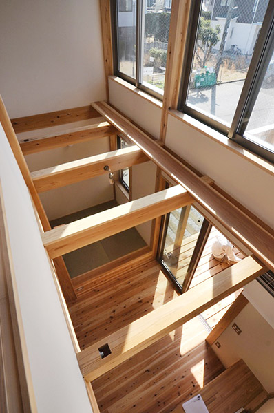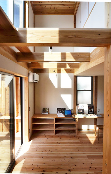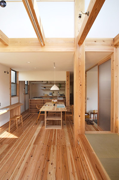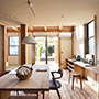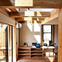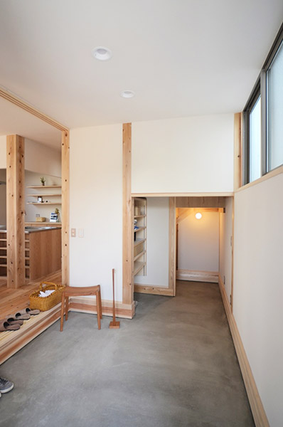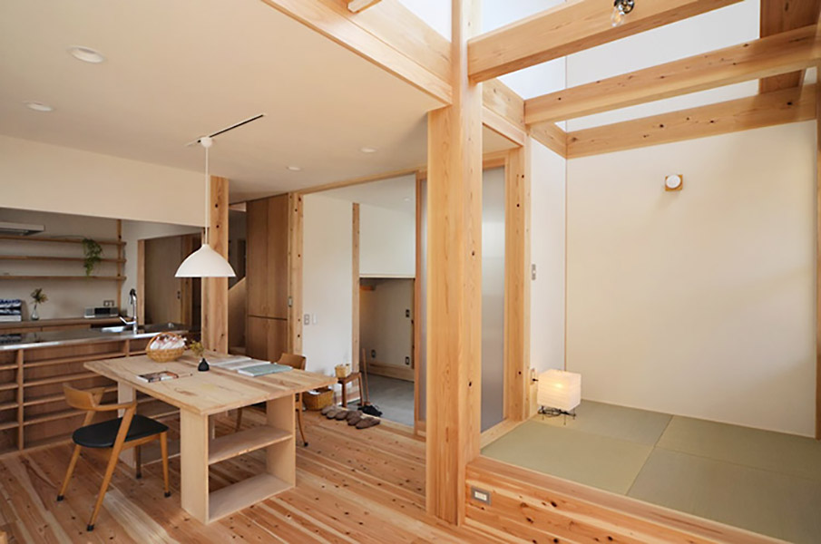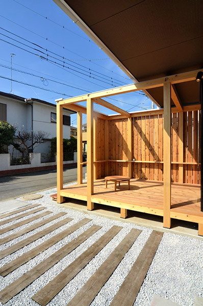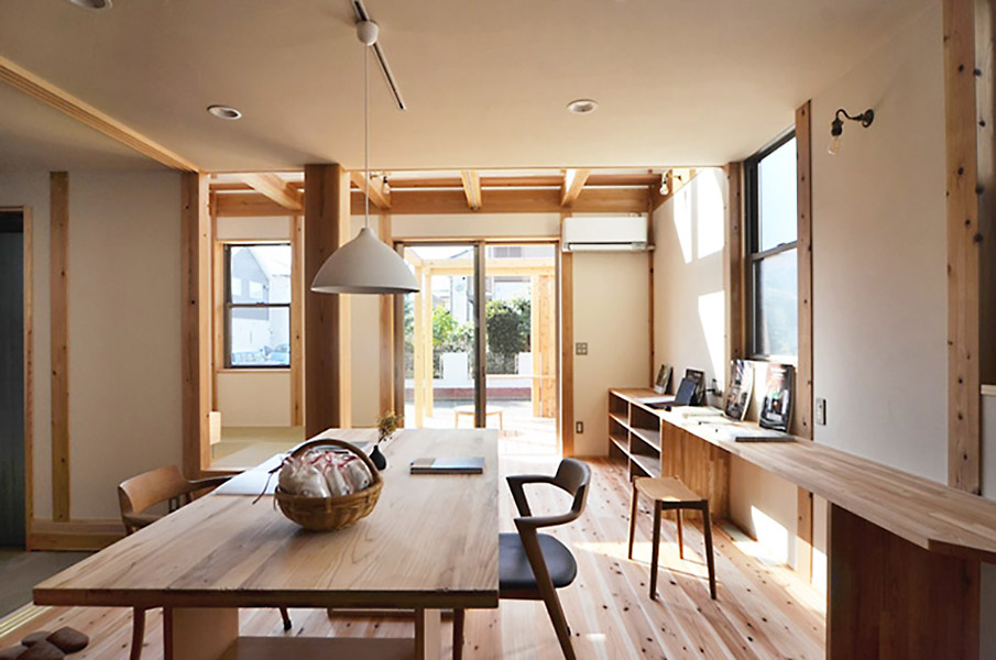 家族が集まるリビングと広めなウッドデッキや多目的な玄関土間を繋ぐことで、家族の時間の楽しみ方の幅を広げています。