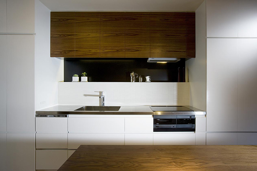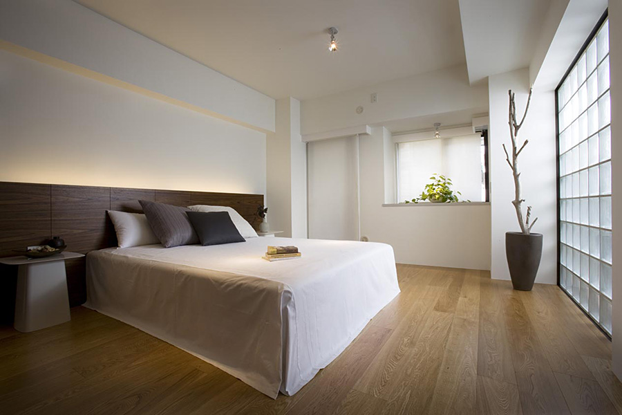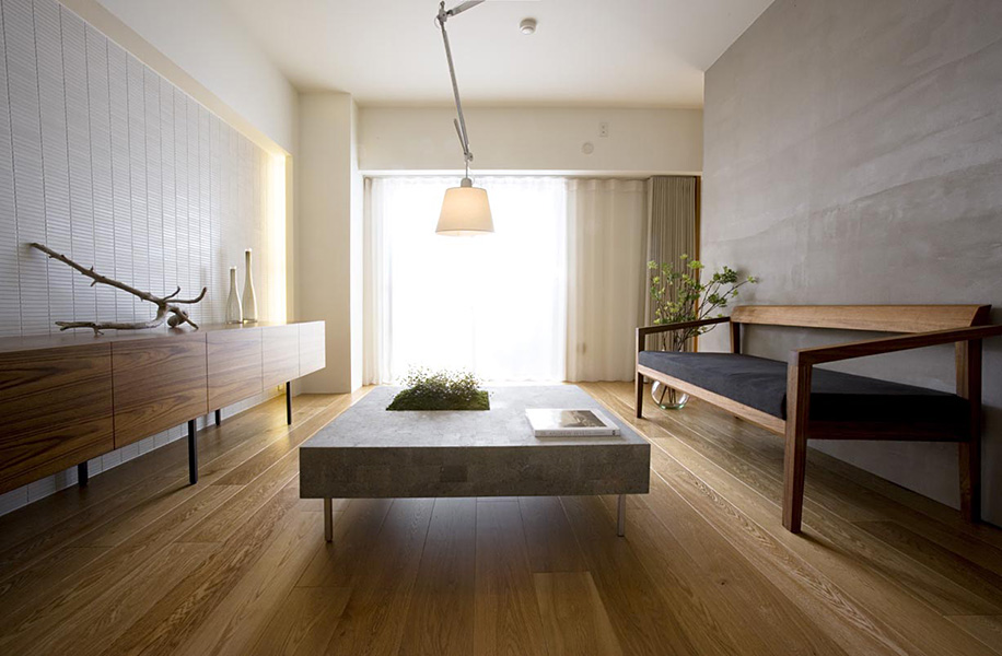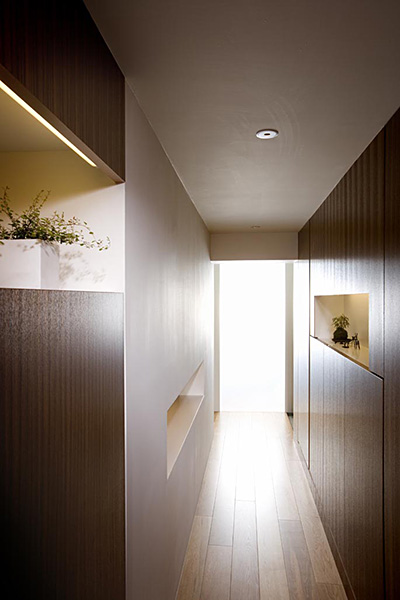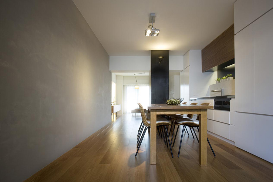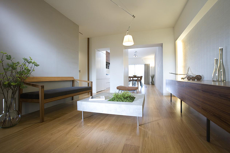この住戸の特徴である東西に開口部・バルコニーがある事を最大限活用し、光や風が通り抜けるよう考慮した。インテリアは開放的な雰囲気を作りながらも、既存の梁やPSも緩やかに空間を繋ぎ、分割できる材料として活かしている。プランは回遊性を持たせ、住人が楽しく快適に生活でいつでも客人を招きたくなるような空間にした。また、ギャラリーとしての機能をもつ廊下には一見わからない用に多くの収納を配している。光・風・人がつながる住宅になるように、設計した。